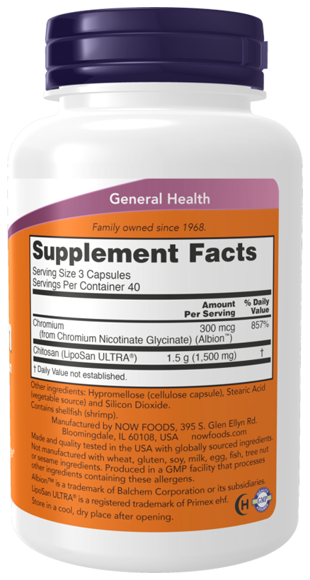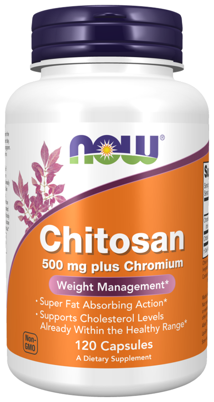Хитозан - это полисахарид, получаемый из панцирей ракообразных, который может связываться с жиром и холестерином в пищеварительном тракте, помогая поддерживать уровень холестерина, уже находящийся в пределах нормы. Хитозан от Now содержит LipoSan Ultra, уникальную форму хитозана с высокой плотностью, которая, согласно лабораторным исследованиям, связывает в пять раз больше жира, чем обычный хитозан. Клиническое исследование продемонстрировало, что LipoSan Ultra может способствовать поддержанию здоровой массы тела. Хром, минерал, необходимый для нормального метаболизма глюкозы, был включен в состав этой формулы.
