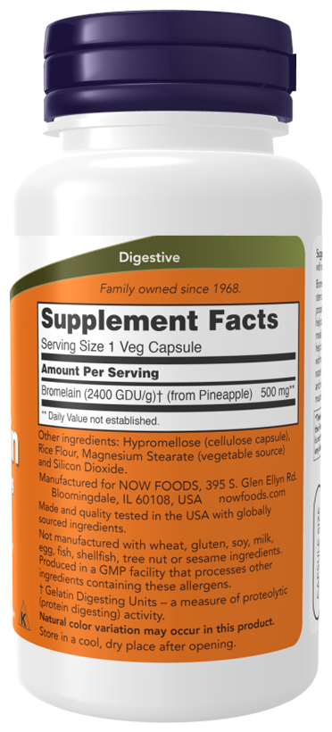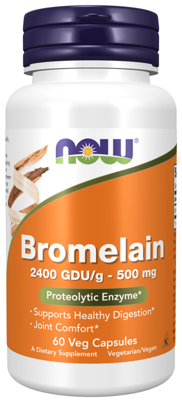 Бромелаин - это протеолитический фермент, получаемый из ананаса, который способствует перевариванию белков. При приеме во время еды бромелаин может способствовать улучшению пищеварения. При приеме в перерывах между приемами пищи он может способствовать сохранению здоровья суставов и устранять временные болевые ощущения, связанные с перенапряжением мышц. Бромелаин обеспечивает природную поддержку нормального пищеварения, а также может снимать неприятные ощущения в мышцах и суставах. Полезные свойства:
