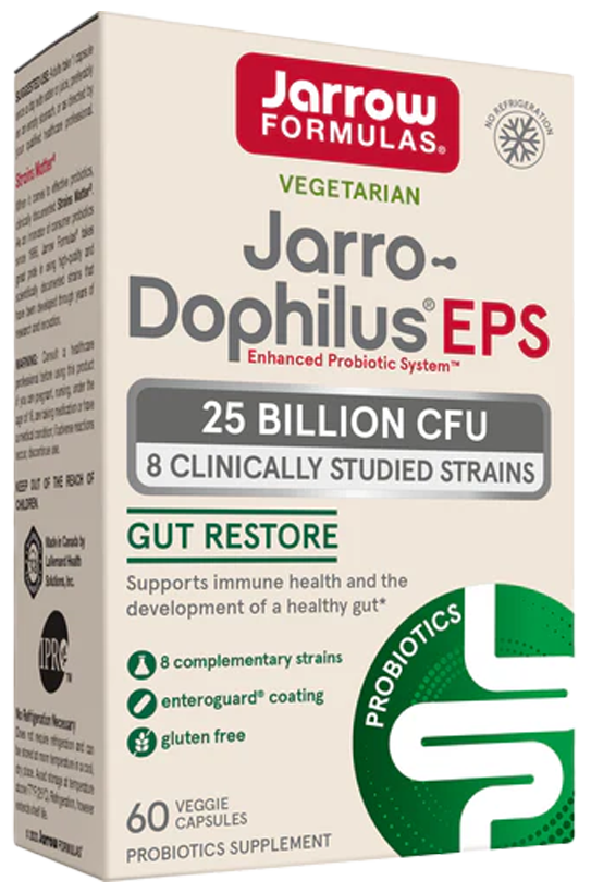 Jarro-Dophilus EPS поддерживает здоровье желудочно-кишечного тракта благодаря сбалансированной смеси тщательно отобранных штаммов пробиотиков для здоровья кишечника и иммунитета. Клинически доказано, что эти штаммы оказывают положительное влияние на здоровье кишечника и иммунитет.